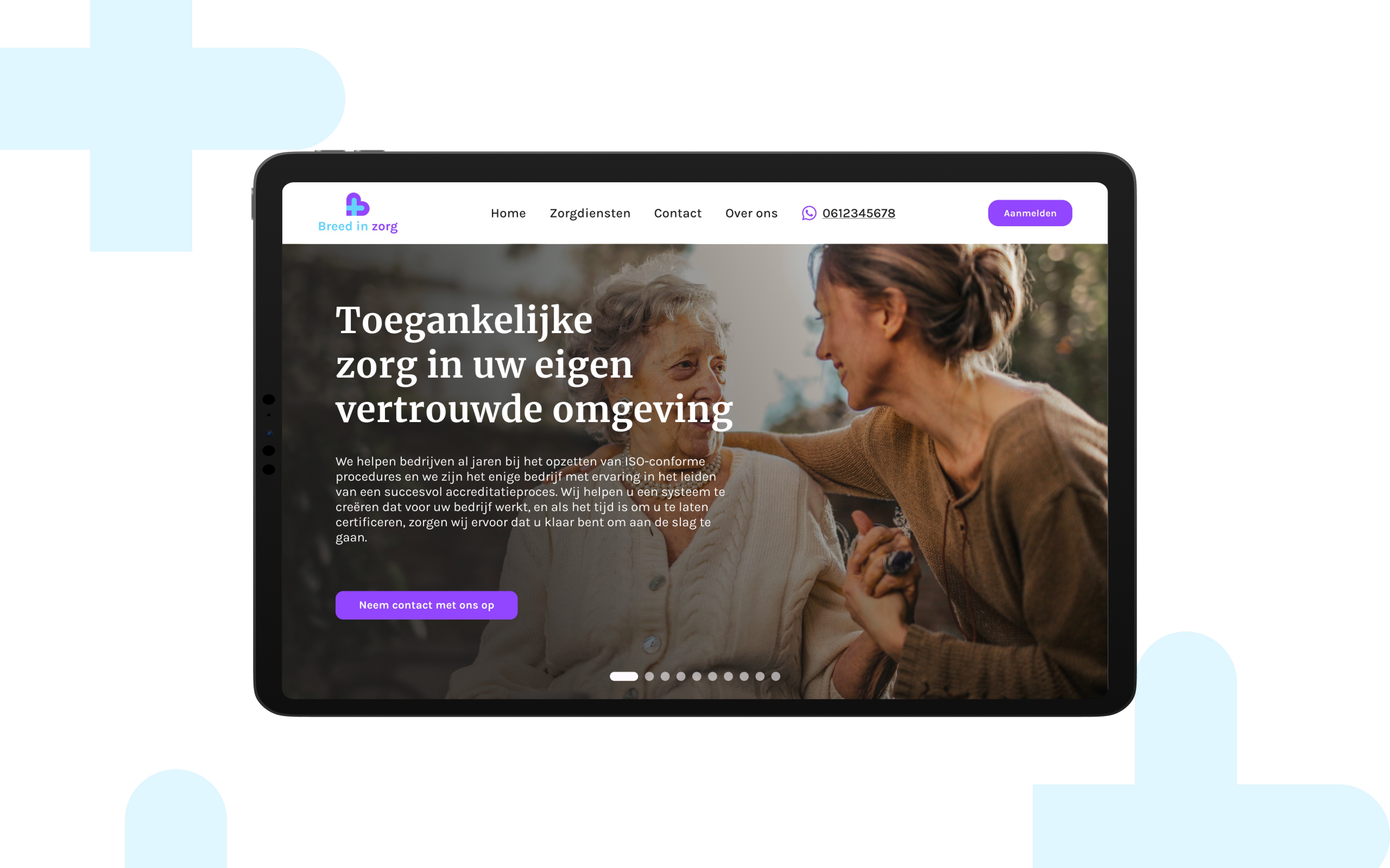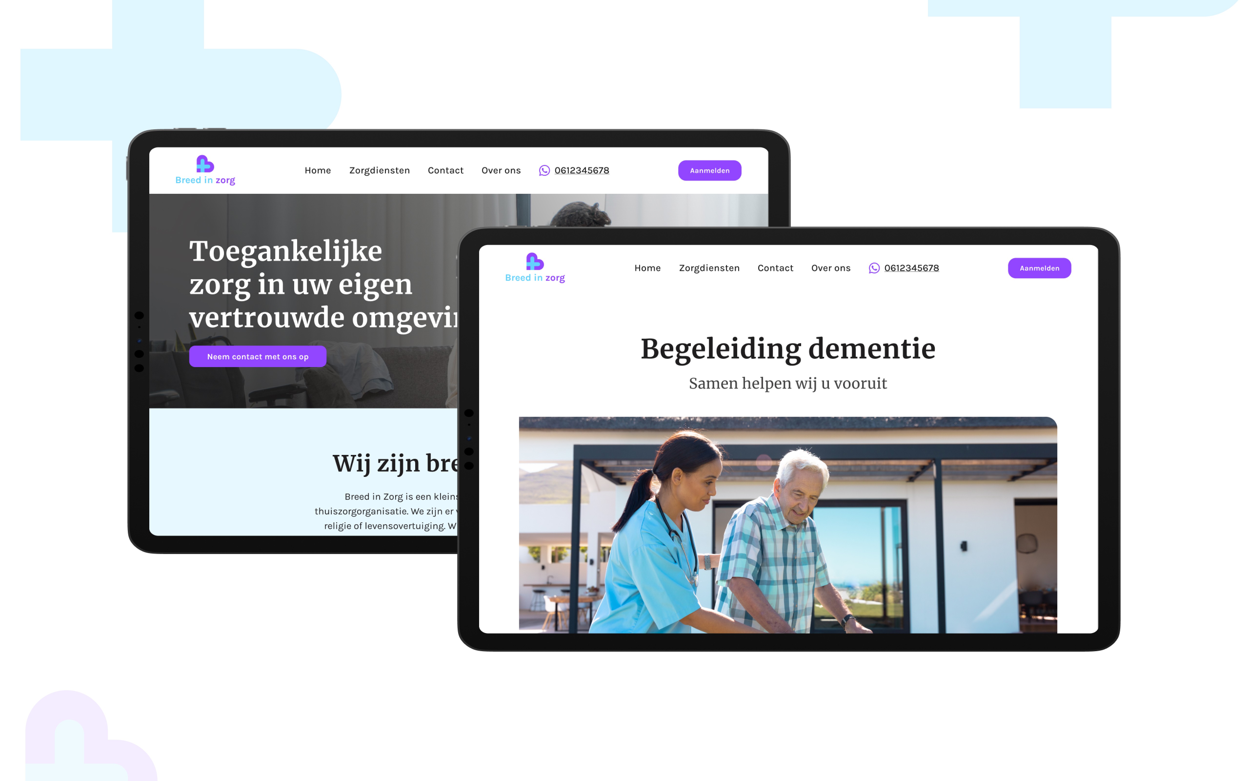 Voor Breed in Zorg heb ik de website en branding ontworpen. De website is gebruiksvriendelijk en biedt duidelijke informatie over zorgdiensten zoals wijkverpleging en ondersteuning bij dementie. Het logo combineert de naam met een herkenbaar zorgsymbool.